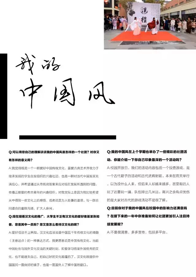 精选部分Q可以用您自己的理解谈谈我的中国风是怎样的一个社团?对你又有怎样的意义吗?我觉得既是一个一群爱好中国传统文化,喜爱古典艺术并致力于继承发扬的学生自发组织的兴趣社团,也是一群对当代中国发展充满信心,并希望通过从传统找答案来应对现在发展所遇到的问题,传播正能量的有志青年的兴趣组织。对我实际上是因为我比较希望从中得到一些文化上的感悟,或者说是为人处事的道理。与一群志同道合的童鞋沟通,扩大人脉网。A该杂志编辑采访于2014年