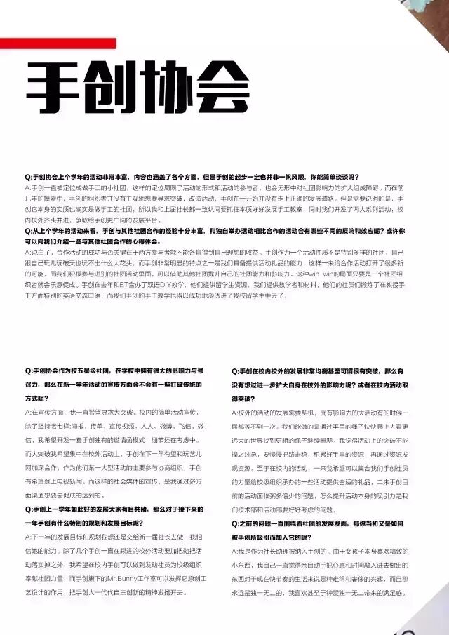 联合源于社团《社联印象》作为社联最具代表性的一本年度杂志,始终要回归到社联的本质,即与社团的交往中去。在这本书中,我们采访了学校一些十分出色的社团。今天与社联对话的是手创协会和我的中国风。05【对话手创协会】